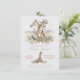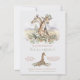 Beautiful watercolor Jungle Giraffes and newborn baby giraffe with floral elements and grasses, foggy mountain outback or Savanna atmosphere with terra-cotta, khaki and green foliage on a faux, very light grey background. The Back is a mottled watercolor green with flower bouquets. Perfect for a safari, zoo, African or wild animal wedding. All wording can be changed to fit your needs, such as a retirement, bridal, baby shower or birthday celebration.