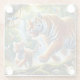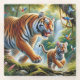 A vibrant scene of a tropical jungle, featuring a majestic tiger and its playful cub as the central figures. They are surrounded by a lush, green environment with varied flora and fauna, including large leafy plants and colourful flowers. Above, a flock of vividly coloured birds with blue and orange feathers perch on tree branches. A waterfall cascades gently in the background, adding a serene and lively touch to the scene. Sunlight filters through the dense canopy, creating a dynamic interplay of light and shadow across the landscape, enhancing the jungle's enchanting atmosphere.