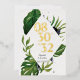 Modern and informal wedding Save The Date card featuring a beautiful illustration of green tropical jungle leaves. Easily add your ceremony date in real gold foil, and the bride and groom's names in dark grey fonts over a geometrical white shape background.