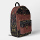 Old world European, exotic and dark, with a slight flavor of the Orient, the beautiful pattern by ZoeSPEAK, in natural colors on this Backpack, was made from Zoe’s original photograph of wrought iron latticework and tropical print fabric. Palm fronds and other tropical leaves, in shades of pale greens, terracotta and beige, rest gracefully on a black background behind the latticework. The design is in the style of a clutch bag or purse, with a floral medallion button closure on a dark background, smooth fabric flap over a faded burgundy textured fabric of the same pattern. The flap is edged with a salmon pink grosgrain ribbon.