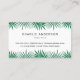 A modern, minimal business card with palm leaves and monstera leaves arranged as a green border top and bottom on the front. Your name is printed in dark grey in the middle. Customisable template fields for name, title and contact information on the back. This designer business card template is perfect for interior designers, beauty salons, decorators, resorts, bloggers, garden designers, gardeners, florists etc.