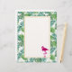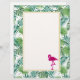 Letterhead with a green tropical leaves pattern and a white frame with a gold border layered over top. A pink flamingo illustration adds a bit of charm.