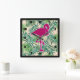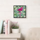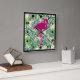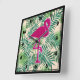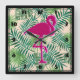 A square clock with a green tropical leaves pattern. A pink flamingo illustration adds a touch of whimsy.