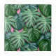 A ceramic tile with a pattern of exotic tropical philodendron leaves in green. Hand painted digital image. A hint of pink in the background.