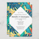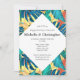 A vibrant pattern of elephant ear and palm fronds in blue, turquoise, orange, yellow and white form a beautiful repeating pattern behind a white diagonal that has black texts for your personalised wording to guests. Celebrate your special party with these unique invites and change the background colour to one of your personal choice.
