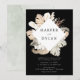 Elegant, modern tropical wedding invitations featuring your wedding names surrounded by a square frame of watercolor flowers and tropical foliage in earthy shades of white, tan, beige, rust, brown, sage, and dark green. Personalise the invitation by adding your wedding details below in white text against a black background. The tropical wedding invitations reverse to a sage green watercolor background.