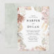 Elegant, modern tropical wedding invitations featuring your wedding details framed by a border of watercolor flowers and tropical foliage in earthy shades of pink, tan, beige, rust, brown, sage, and dark green. The tropical wedding invitations reverse to a sage green watercolor background.