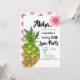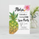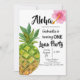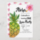 Tropical Luau celebration for a First birthday party. This invitation has a large watercolor pineapple off to the side with a pink hibiscus off the corner. Personalise with your party information.