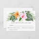 A lovely tropical themed bouquet of watercolor pink and orange hibiscus blossoms, palm fronds and tropical greenery accent this wedding RSVP response card. Personalise with your required RSVP date. This response card is a wonderful choice for beach weddings, destination weddings or weddings with a tropical or Hawaiian theme.