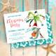 Tropical, cute Christmas party invitation features a guitar-playing dolphin in a Santa hat leaning against a palm tree decorated with festive ornaments, singing the Hawaiian Christmas song "Mele Kalikimaka". Reverse side is aqua blue with white hibiscus flowers. Personalise with your event details. Original artwork KL Stock.