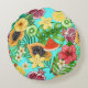 Tropical mix-fruit, flowers and leaves on blue round cushion