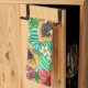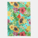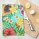 Tropical mix-fruit, flowers and leaves on blue tea towel