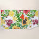 Tropical mix-fruit, flowers and leaves on white beach towel