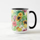 Tropical mix-fruit, flowers and leaves on white mug