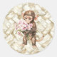 This sticker design features a cute monkey holding orchid flowers on a woven background.