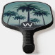 Monogram pickleball paddle featuring a modern tropical palm tree design. Customise the text with your desired monogram and name. Use the template to create your own monogram pickleball paddle.
