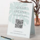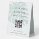 Elevate your business display with this Island Escapes tabletop tent sign, crafted from sturdy plastic for everyday use. Featuring a fresh mint green monstera leaf design and modern typography, it blends style with function. The customisable layout includes space for your business name, tagline, and a QR code, giving customers quick and convenient access to your website or menu. Perfect for vacation rentals, boutiques, and coastal-inspired shops, this tent sign adds a polished finishing touch to any professional setting.