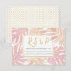 Tropical leaves blush pink and gold wedding RSVP response card. This lovely design showcases leaves of Split Leaf Philodendron (Monstera deliciosa) or Swiss Cheese Plant and palm leaves in pink with gold outline. Your text is in a white frame with gold outline. The back includes a gold polka dot pattern on white. Choose it for your tropical beach wedding, coastal wedding or destination wedding.