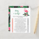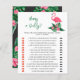 Baby shower invitation design features pink flamingo with lush green palm leaf fronds and tropical hibiscus flowers. "Aloha Baby". A tropical floral pattern with black background colour dresses up the back of the card.