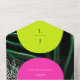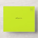 Neon yellow and pink arches over dark palm leaf background with monogram at top over yellow arch. White palm leaf illustration at left and palm tree illustration at bottom right on R.S.V.P. card. R.S.V.P. includes QR code to replace with your own. Outside is neon yellow with black text which includes return address (top flap), "deliver to" script (centre), and address at bottom (back of rsvp).