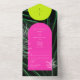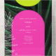 Neon yellow and pink arches over dark palm leaf background with monogram at top over yellow arch. White palm leaf illustration at left and palm tree illustration at bottom right on R.S.V.P. card. Outside is neon yellow with black text which includes return address (top flap), "deliver to" script (centre), and address at bottom (back of rsvp).