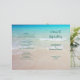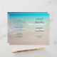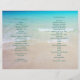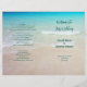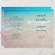 Tropical beach wedding folded ceremony program. Turquoise ocean water and smooth beach sand is the background for this custom program that will be folded in half. Casual font in dark grey is easy to customise on four "pages". Sand dollars and starfish decorate to represent the couple.