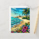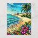 Missing you while on vacation postcard. Pretty tropical coastal shoreline. Pretty blue water, palm trees, tropical flowers and a lighthouse in the background. Ai art done in a comic book pop art style.