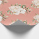 This elegant gift wrapping paper features a watercolor style floral theme, with an image of a tropical Hawaiian style bouquet. Beautiful white orchids are paired with monstera and palm leaves in the top right corner. The background is a luxurious coral shade.