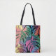 Features a bold, modern style painted palm leaf print in tropical colours of coral, turquoise, yellow and pink. Set against a black background.
