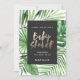 Modern tropical palm leaf watercolor foliage baby shower invitations. Hand painted gold effect script text. Part of a on trend summer collection. Background colour can be changed.