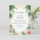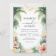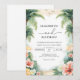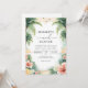 Evoke a breezy island paradise with this vibrant tropical design. Lush palm fronds and exotic blooms frame a serene beach scene, perfect for an unforgettable destination ceremony.