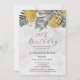 Elegant and chic tropical palm bridal shower invitation features a top arrangement of black line drawn palm leaves and gold textured foliage. The birthday heading is written in a modern and open script. A soft and romantic grey watercolor wash pulls the design together on the front and back. Very easy to customise. This item is part of the Elegant Tropical Palm collection. The timeless aesthetic makes this appropriate for any time of the year.