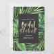 Tropical palm leaf and gold script bridal shower save the date