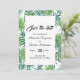 An elegant floral tropical greenery save the date for a wedding card. Templates for names and wedding date. An elegant white background, black letters. Watercolored green palm tree leaves and foliage as a frame.
