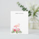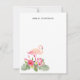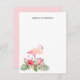 Personalised flat vertical note card features a custom first name in modern black text, accented with a pretty pink flamingo standing in lush green tropical palm leaves and pink hibiscus flowers. A breezy, colourful, and girly stationery design for summertime.