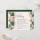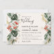 This Tropical Palm Wedding invitation features a tropical pink flowers, palm and monstera leaves, elegant golden splashes. The reverse side of this invitation is dark green . Perfect for a modern beach wedding.