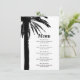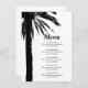 Tropical palm tree beach wedding menu template. Elegant template for classy wedding party at the seaside. Beautiful black palm leaves silhouette with stylish script typography. Customisable templates for couples getting married. Part of beautiful matching set.