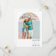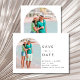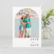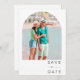 Tropical palm tree save the date for your destination beach wedding. The front of this save the date features an arch photograph of a pristine tropical beach, transporting your guests to a tropical paradise. The backside of the save the date features an arch photo and is customized with your wedding details.