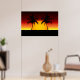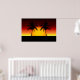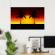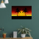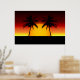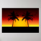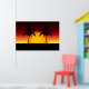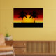 A vibrant tropical scene with palm tree silhouettes and a large yellow sun. Birds fly across a warm red and orange sky, capturing a peaceful summer beach atmosphere. This high-contrast silhouette design is perfect for those who enjoy coastal scenery and travel.