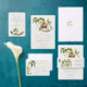 This wedding invitation is a tropical jungle design with the colours of nature. It features palm trees, luscious rainforests, and bungalows nestled within a beautiful tropical paradise setting.
