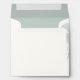 Custom square wedding invitation envelope in cream, with graphics of a pale teal palm tree, on the front, and a light teal colour lining the inside of the envelope. Black text, on the back flap, is fully customisable to suit your needs. Lovely finishing touch to our beach theme palm tree wedding set.