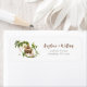 Tropical palm trees wedding return address design featuring a cozy beach hut, lush greenery, and elegant script text. Perfect for couples planning a tropical palm trees wedding, adding a stylish island destination touch to envelopes and stationery.