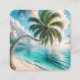 A curved palm tree with a swing hanging from it is situated on a sandy ocean beach