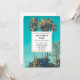 Wedding invitation with a beautiful photograph. Big palm trees with long trunks in front of a lovely green sky. Retro colour scheme. Relaxing and chill.