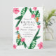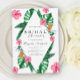 Design features an watercolor elegant bouquet of classic beach watercolor greenery and flowers, including blush pink hibiscus, orange and blue bird of paradise, green greenery and dark green palm leaf.
