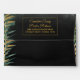 An elegant watercolor painted tropical wedding invitation featuring elegant subtle green and gold palm leaves against a dramatic black watercolor wash with an elegant and lively gold script calligraphy announcing your wedding details.