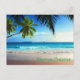 Perfect photo on a perfect day in the tropics! Blue tropical sea waves, white sandy tropical beach with lush green palm trees. The day is sunny and warm with a lite blue sky in this tropical island paradise beach scene.
