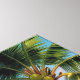 A beautiful canvas wall art with a seaside tropical paradise illustration of a boardwalk along the coast, with palm trees with coconuts and strung fairy lights, blue ocean waves and small whimsical cottages.