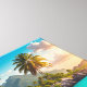 A tropical paradise with view of ocean, palm trees and purple flowers around it, small beach area. Acrylic painting design style.