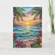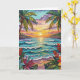 Pretty tropical thinking of you card. A cute coastal themed poem for a friend of family member to let them know they are in your thoughts. Gorgeous ai impasto oil painting style illustration of the blue ocean, a sandy beach surrounded by palm trees at sunset. Inside is a cute crab and sea glass.